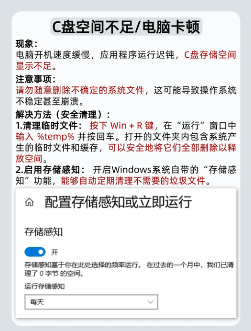 3:C盘爆红/电脑卡顿🐢: 解决方法: Win+R搜%temp%清临时文件,开启Win系统自带的‘存储感知’自动清理。