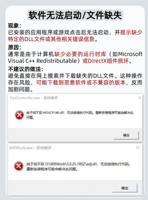 4:软件打不开/文件丢失📄: 原因: 多半是缺少运行时库。 解决方法: 避免乱下DLL文件!建议用专业DLL修复工具一键修复。