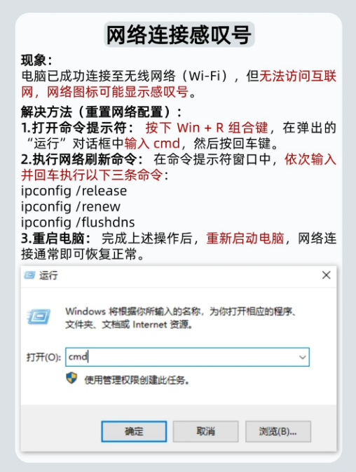 2:网络感叹号📶: 解决方法: Win+R搜cmd,依次输入并回车执行:ipconfig /release ipconfig /renew ipconfig /flushdns,再重启电脑。