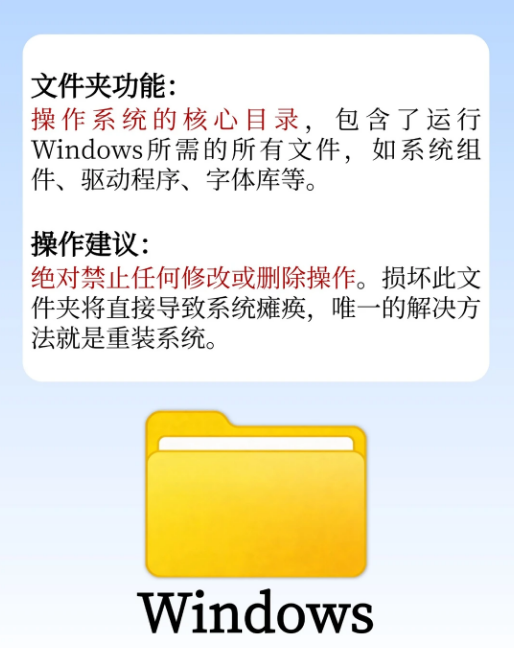 C盘又爆满啦?每次清理C盘是不是都心惊胆战,生怕误删了什么重要文件? 这份超详细的Windows文件夹清理指南,救你一命!图里这6个文件夹,有些是千万不能碰的“禁区”,比如Windows和Program Files,删错直接系统瘫痪! 但也有一些,可以放心大胆地删,能帮你腾出不少空间哦!