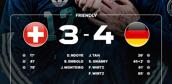 北京时间3月28日03:45,国际足球友谊赛,瑞士在主场圣雅克布公园球场迎战德国。上半场恩多耶爆射破门,若纳坦·塔头球扳平,恩博洛进球帮助瑞士再度将比分超出,格纳布里补时扳平,上半场瑞士暂2-2德国;下半场维尔茨世界波直挂死角,替补登场的乔尔·蒙特罗还了一记世界波,比赛尾声阶段维尔茨锁定胜局,最终德国4-3瑞士。