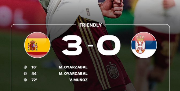 北京时间3月28日04:00,国际足球友谊赛,西班牙在陶瓷球场与塞尔维亚进行一场友谊赛。上半场,奥亚萨瓦尔梅开二度。西班牙半场2-0领先塞尔维亚。下半场,穆尼奥斯替补登场,完成西班牙国家队首秀并且打进一球。最终西班牙3-0击败塞尔维亚。
