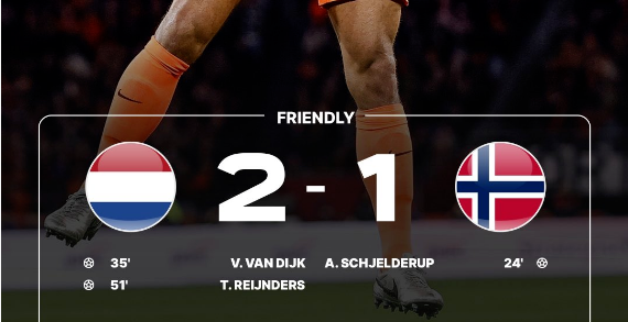 北京时间3月28日03:45,国际足球友谊赛,荷兰在主场在约翰・克鲁伊夫竞技场迎战挪威。上半场谢尔德鲁普首开记录,范戴克头球扳平,半场结束,双方1-1战平。易边再战,赖因德斯反超比分,邓弗里斯助攻。最终荷兰主场2-1逆转挪威。