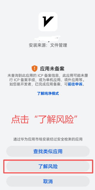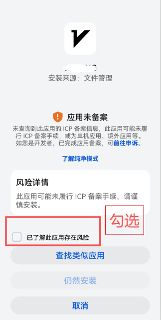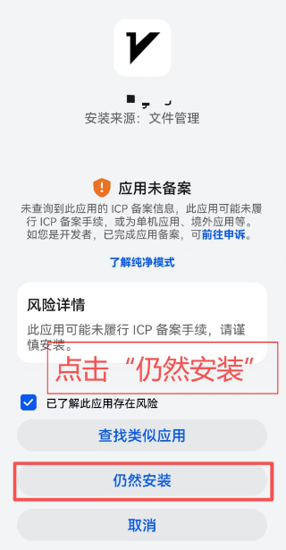 第二步将你的应用保存到文件管理,点击“打开为应用”-“了解风险”-“已了解”-“仍然安装”