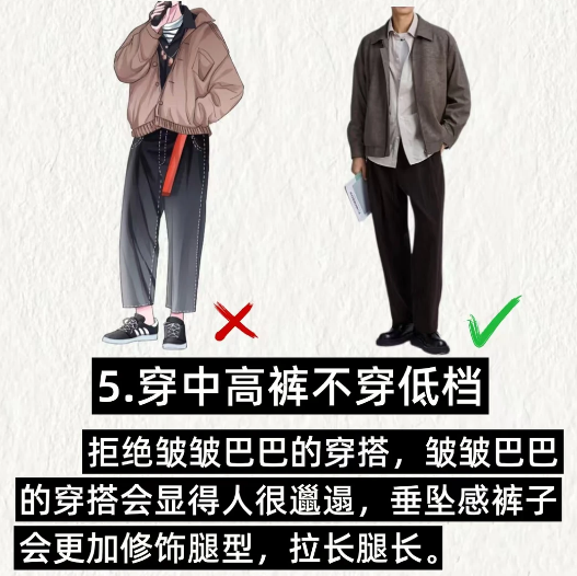 . 5️⃣穿中高裤不穿低档:拒绝皱皱巴巴的穿搭,皱皱巴巴的穿搭会显得人很邋遢,垂坠感裤子会更加修饰腿型,拉长腿长。