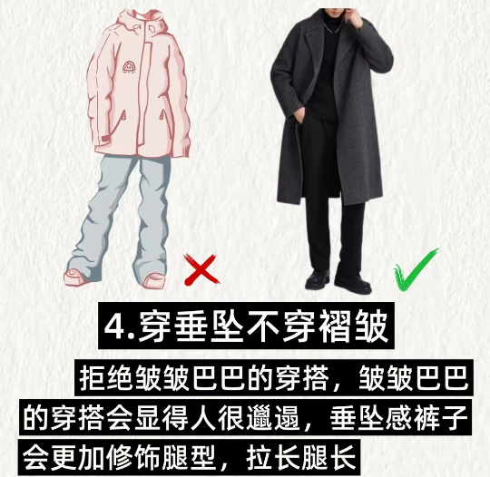 . 4️⃣穿垂坠不穿褶皱:拒绝皱皱巴巴的穿搭,皱皱巴巴的穿搭会显得人很邋遢,垂坠感裤子会更加修饰腿型,拉长腿长