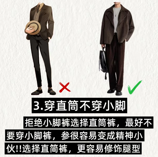 . 3️⃣穿直筒不穿小脚:拒绝小脚裤选择直筒裤,最好不要穿小脚裤,参很容易变成精神小伙!!选择直简裤,更容易修饰腿型