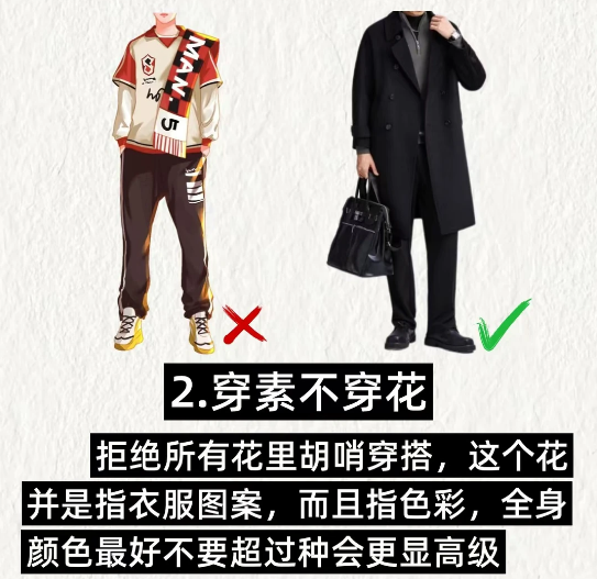 . 2️⃣穿素不穿花:拒绝所有花里胡哨穿搭,这个花并是指衣服图案,而且指色彩,全身颜色最好不要超过种会更显高级