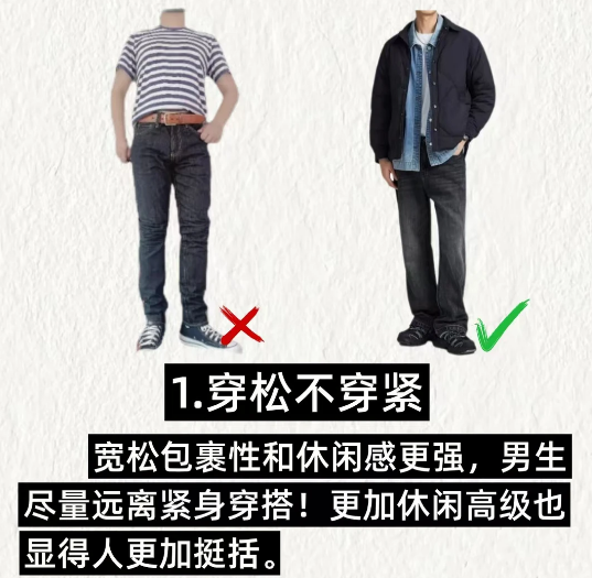 . 1️⃣穿松不穿紧:宽松包裹性和休闲感更强,男生尽量远离紧身穿搭!更加休闲高级也显得人更加挺括。