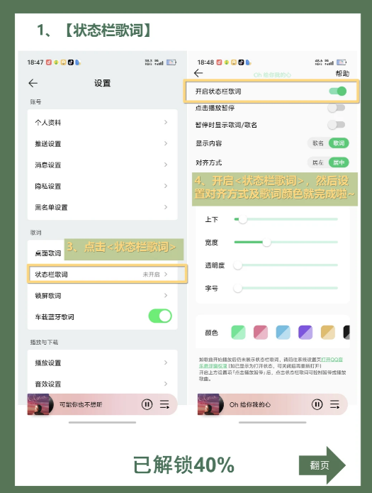 1️⃣设置状态栏歌词:在桌面状态栏就能看到音乐歌词哦,这里展示的是qq音乐的设置步骤,i音乐和网易云也都能这样设置~