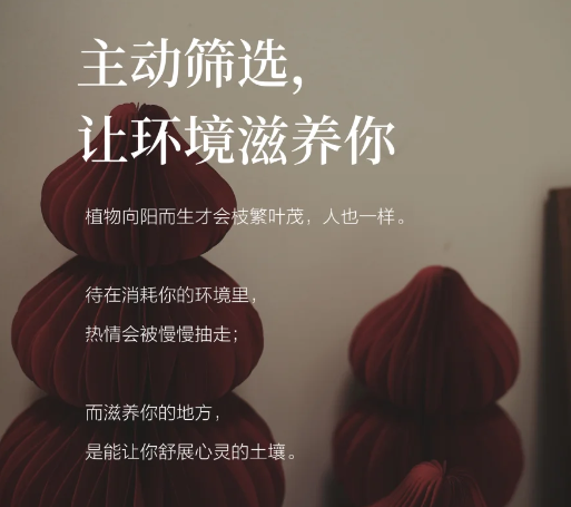 植物向阳而生才会枝繁叶茂,人也一样。 待在消耗你的环境里,热情会被慢慢抽走; 而滋养你的地方,是能让你舒展心灵的土壤。 两个小行动: · 给社交圈断舍离,减少和爱泼冷水的人相处 · 把居住空间变成疗愈基地,摆上绿植和喜欢的书
