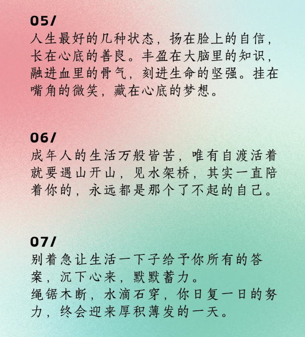 05/ 人生最好的几种状态, 扬在脸上的自信,长在心底的善良。 丰盈在大脑里的知识,融进血里的骨气, 刻进生命的坚强。 挂在嘴角的微笑,藏在心底的梦想。