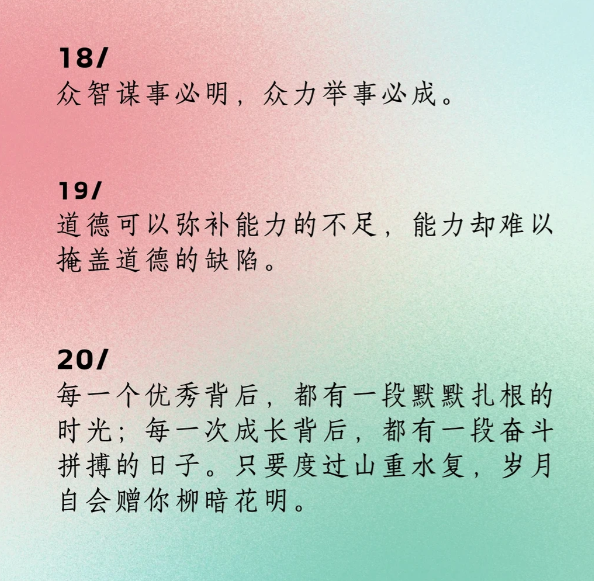 20/ 每一个优秀背后,都有一段默默扎根的时光; 每一次成长背后,都有一段奋斗拼搏的日子。 只要度过山重水复,岁月自会赠你柳暗花明。
