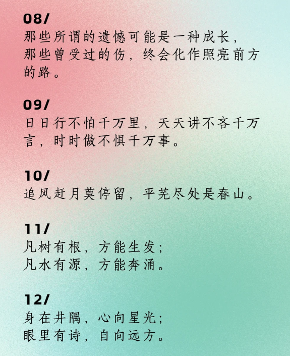 01/ 人生这条路很长,未来如星辰大海般璀璨,不必踟躇于过去的半亩方塘。那些所谓的遗憾,可能是一种成长,那些曾受过的伤,终会化作照亮前路的光。
