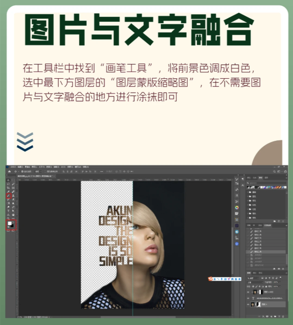 6、在工具栏中找到“画笔工具”,将前景色调成白色,选中最下方图层的“图层蒙版缩略图”,在不需要图片与文字融合的地方进行涂抹即可