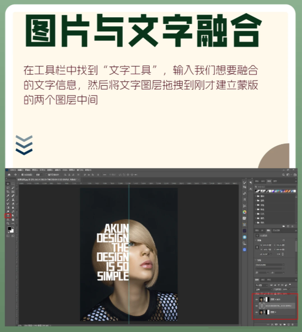 4、在工具栏中找到“文字工具”,输入我们想要融合的文字信息,然后将文字图层拖拽到刚才建立蒙版的两个图层中间