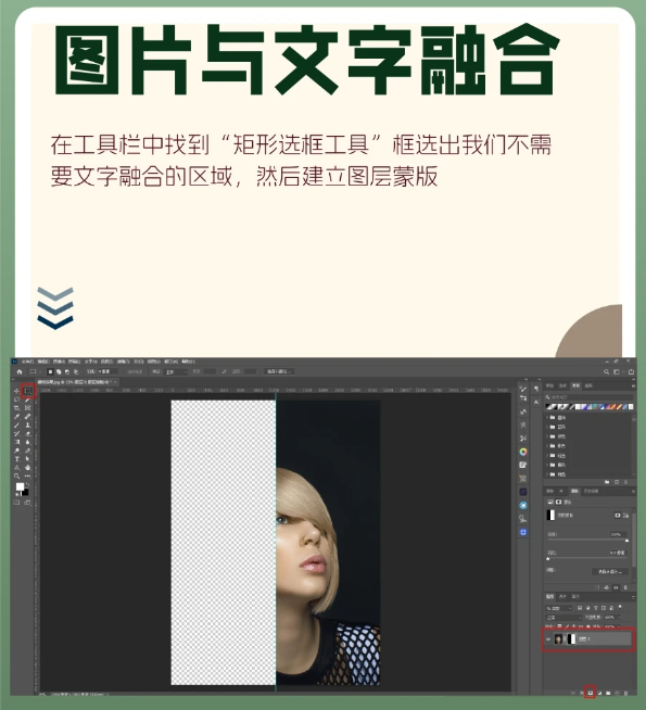 2、在工具栏中找到“矩形选框工具”框选出我们不需要文字融合的区域,然后建立图层蒙版