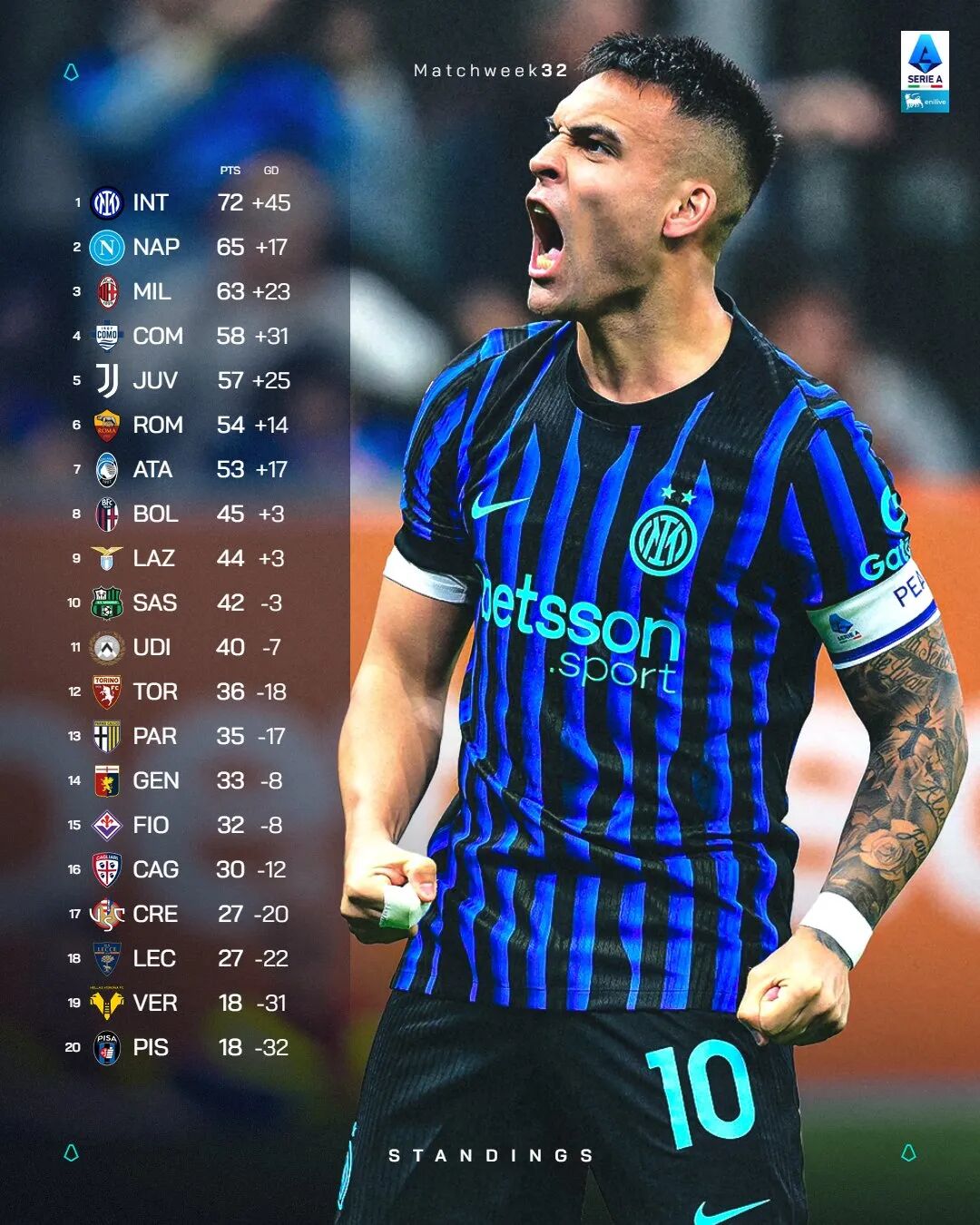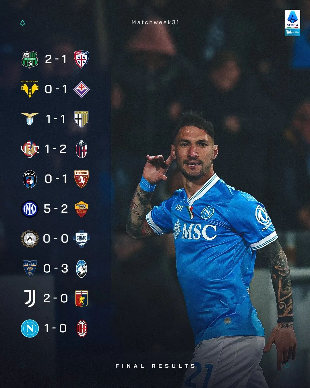 北京时间4月7日凌晨,意甲第31轮10场比赛全部结束。本轮联赛有两场焦点对话,国际米兰主场5比2大胜罗马,继续强势领跑积分榜,而那不勒斯主场1比0力克AC米兰,积分榜也完成了对对手的反超。科莫本轮遭到乌迪内斯逼平,第五名的尤文图斯2比0轻取热那亚,将与科莫的分差缩小至1分,而罗马惨败国米后,身后的亚特兰大在取胜后也只有1分之差。