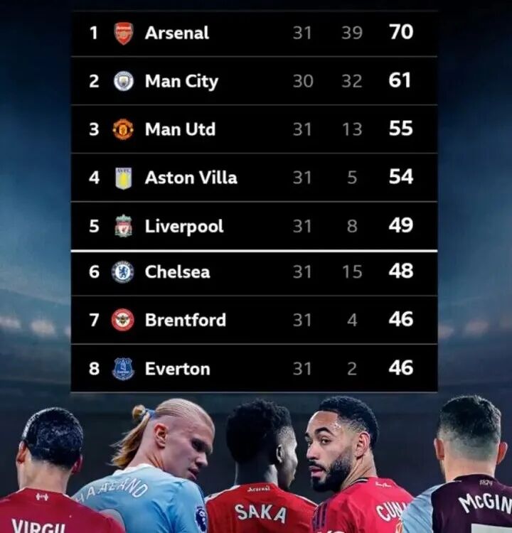 目前,利物浦积49分排在英超积分榜第5位,切尔西积48分排在第6位。