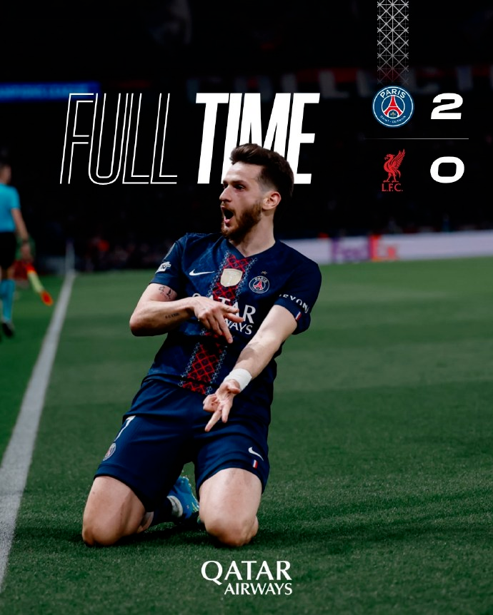 北京时间4月9日03:00,欧冠1/4决赛首回合,巴黎圣日耳曼在主场王子公园球场迎战利物浦。上半场第11分钟杜埃破门首开纪录,利物浦半场仅有1次射门,没有完成射正。巴黎半场1-0领先利物浦。易边再战,内维斯送出助攻,克瓦拉茨赫利亚扩大领先优势。最终巴黎2-0击败利物浦,双方次回合比赛将于北京时间4月15日03:00移师利物浦主场进行。