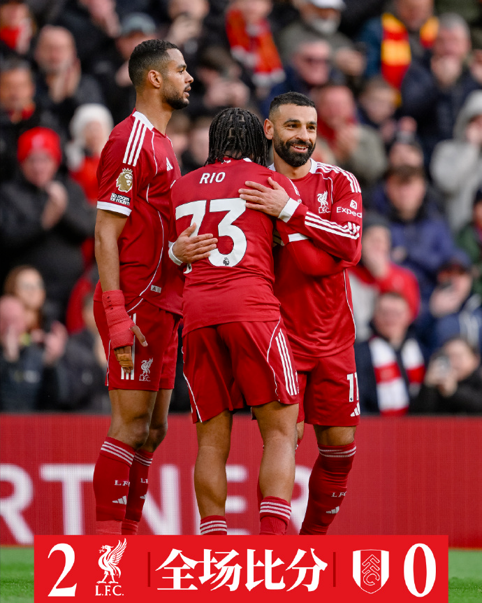 北京时间4月12日00:30,英超联赛第32轮,利物浦在主场安菲尔德球场迎战富勒姆。上半场,恩古莫哈禁区内晃动,右脚精彩兜射破门!随后恩古莫哈再次策动攻势,加克波助攻萨拉赫再下一城!柯蒂斯·琼斯内收肌受伤无奈伤退。半场结束,利物浦2-0富勒姆。易边再战,双方均无建树。最终,利物浦主场2-0击败富勒姆,终结各项赛事3连败,先赛领先身后的切尔西4分。