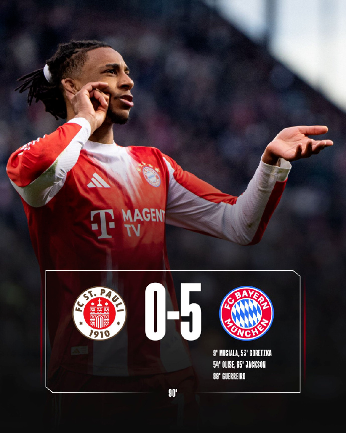 北京时间4月12日00:30,德甲联赛第29轮,圣保利在主场米勒门球场迎战拜仁。上半场穆西亚拉头球破门,随后又有一次击中立柱,拜仁暂1-0圣保利;下半场格雷茨卡进球,奥利塞再下一城,杰克逊建功,格雷罗锁定胜局,最终拜仁5-0圣保利,本赛季已打进105球,打破俱乐部在1971-72赛季创造的德甲联赛单赛季进球纪录,各项赛事收获五连胜,12分优势领跑积分榜,夺冠在望。